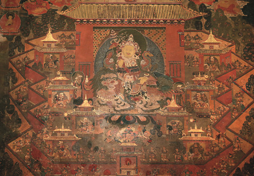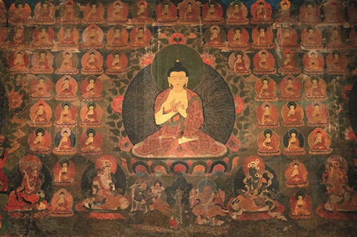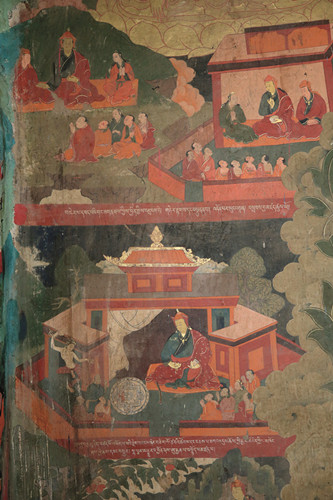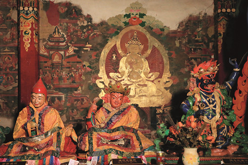 གོང་དུ་ཞུས་པ་ལྟར་ཕྱོགས་བཞིའི་ལྡེབས་ངོས་སུ་ལོ་རྒྱུས་དང་སྒྱུ་རྩལ་གྱི་རང་བཞིན་ལྡན་པའི་བོད་རྒྱུད་ནང་བསྟན་གྱི་སྲོལ་རྒྱུན་རི་མོའི་ལུགས་སྒར་བྲིས་གཙོ་བོར་བྱས་པའི་སྨན་གསར་རྙིང་སོགས་གཞན་ལུགས་ཀྱི་རི་མོའི་སྒྱུ་རྩལ་དང་ཉམས་སོགས་ལེགས་ཆ་ཕྱོགས་གཅིག་ཏུ་སྙིགས་དོར་བཅུད་ལེན་བྱས་པའི་དབུས་དང་གཡས་གཡོན་ལོགས་གསུམ་གྱི་ལྡེབས་རིས་ཀྱི་གཙོ་སྐུ་རྣམས་རྒྱལ་བ་རིགས་ལྔའི་སྐུ་ལ་གསེར་འོད་ཀྱི་གཟི་མདངས་ལྷམ་མེར་འཕྲོ་ཞིང་གཙོ་སྐུ་རེ་རེའི་འོག་བྱང་ཆུབ་སེམས་དཔའ་ཉེ་སྲས་བརྒྱད་ལས་བྱང་སེམས་འཕགས་པའི་འཁོར་གཉིས་རེ་དང་འཕགས་པའི་གནས་བསྟན་བཅུ་དྲུག་ལས་ཉན་ཐོས་ཀྱི་སྡེ་དགྲ་བཅོམ་གཉིས་རེའི་འཁོར་བྱས་པ་དང་། སྟེང་གི་ཆར་བསྐལ་བཟང་སངས་རྒྱས་སྟོང་རྩ་གཉིས་ཀྱི་སྐུ་ནམ་མཁའི་སྤྲིན་གཏིབས་པར་བཞིན་བཞུགས་ཡོད་པ་དང་། སྒོ་ལོགས་གཉིས་ལས་གཡོན་གྱི་དབུས་སུ་དཔལ་ས་སྐྱ་པའི་བཀའི་བསྲུང་མ་རྔམ་སྟོབས་དང་གཟི་འོད་ཕྱོགས་བརྒྱར་འབར་བའི་དཔལ་རྡོ་རྗེ་ནག་པོ་ཆེན་པོ་གུར་གྱི་མགོན་པོ་སྐུ་མདོག་ཆར་སྤྲིན་ལྟར་གནག་པ་སྤྲུལ་པའི་ཕོ་ཉ་ལྔ་རུ་འདྲེན་སྡེ་བཞིའི་འཁོར་དང་བཅས་པ་བཞུགས་པའི་སྟེང་གི་ཆར་རྒྱལ་བ་རྡོ་རྗེ་འཆང་ཆེན། དེའི་གཡས་སུ་སློབ་དཔོན་བྲམ་ཟེ་མཆོག་སྲེད། གཡོན་དུ་ཡེ་ཤེས་ཀྱི་མཁའ་འགྲོ་མ་ལ་ལི་ཏ། དེ་དག་གི་གཡས་གཡོན་དུ་བཞུགས་པའི་པཎ་བདེ་བའི་རྡོ་རྗེ། བླ་མ་ས་སྐྱ་པ་ཆེན་པོ་ཀུན་དགའ་སྙིང་པོ། ཤྲངྡྷ་ཀ་ར་ཝརྨ། མལ་ལོ་ཙཱ་བ་བློ་གྲོས་གྲགས་པ། རྗེ་བཙུན་སངས་རྒྱས་རྒྱ་མཚོ། གྲུབ་ཆེན་བཀྲ་ཤིས་ལྷུན་གྲུབ། འཇམ་དཔལ་རྒྱ་མཚོ། མཁན་ཆེན་དཔལ་ལྡན་ཆོས་སྐྱོང་སོགས་རྩ་རྒྱུད་ཀྱི་བླ་མ་རྣམས་བཞུགས་ཤིང་། གཙོ་བོའི་གཡོན་ཕྱོགས་སུ་སྟེང་གི་ཆར་མེ་དཔུང་འབར་བའི་ཀློང་ན་མགོན་དཀར་ཞལ་གསུམ་ཕྱག་དྲུག་བཞེངས་སྟབས་སུ་བཞུགས་པ། དེའི་འོག་ཏུ་ཡུམ་ཆེན་ཨེ་ཀ་ཛ་ཊའི། དེའི་འོག་ཏུ་ཁྲག་ཞག་འཁྲུགས་པའི་རྒྱ་མཚོ་ཆེན་པོའི་ཀློང་ན་དཔལ་ལྡན་ལྷ་མོ་འདོད་པ་ཁམས་ཀྱི་དབང་ཕྱུག་མ་བང་བུ་ག་པ་ལ་ཞོན་པ། དེའི་འོག་ཏུ་དཔལ་ལྡན་ལྷ་མོ་དམག་ཟོར་རྒྱལ་མོ་དྲེའུ་དམར་པོ་ལ་ཞོན་པ། དེའི་འོག་གི་མདུན་ངོས་སུ་ལེགས་ལྡན་མགོན་པོ་མ་ཧཱ་ཀ་ལ་རྒྱ་སྟག་ཁྲ་བོ་ལ་ཞོན་པ། གཙོ་བོའི་གཡས་ཕྱོགས་སྟེང་གི་ཆར་དཔལ་ཕྱག་ན་རྡོ་རྗེ་ཁྲོ་བོའི་དབང་པོ་འབྱུང་པོ་འདུལ་བྱེད། དེའི་འོག་ཏུ་དཔལ་རྡོ་རྗེ་ནག་པོ་ཆེན་པོ་གདོང་བཞི་པའི་སྤྲུལ་པའི་རང་གཟུགས་མགོན་པོ་བྲམ་ཟེའི་གཟུགས་ཆེན། དེའི་འོག་ཏུ་དཔལ་དུར་ཁྲོད་ཀྱི་བདག་པོ་ཡབ་ཡུམ། དེའི་འོག་ཏུ་གནོད་སྦྱིན་ཤན་པ་དམར་པོ་བེག་རྩེ་དང་གཙོ་བོའི་པད་གདན་གྱི་མདུན་ཐད་ལས་མགོན་གནོད་སྦྱིན་ནག་པོ་ཡབ་ཡུམ་ལ་འཁོར་པུ་ཏྲ་མིང་སྲིང་གསུམ་གྱིས་བསྐོར