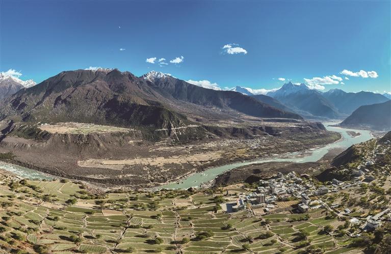 བོད་ལྗོངས་ཉིང་ཁྲི་གྲོང་ཁྱེར་སྨན་གླིང་རྫོང་ཕད་གྲོང་རྡལ་ཟུར་གསུམ་གྲོང་ཚོར་ཡར་ཀླུང་གཙང་པོའི་གྲོག་རོང་ཆེན་པོ་རྔམ་བརྗིད་ཆེ་ཞིང་། ཡུལ་མིའི་སྡོད་ཁང་དང་། བགྲོད་ལམ། གངས་རི། གདོད་མའི་ནགས་ཚལ་བཅས་གཅིག་ལ་གཅིག་རྒྱན་ལྟར་དུ་སྣང་ནས། བརྗིད་ཆགས་ལྟ་ན་སྡུག་པའི་གྲོག་རོང་གི་སྐྱེ་ཁམས་མཛེས་རིས་ཤིག་གྲུབ་ཡོད།
