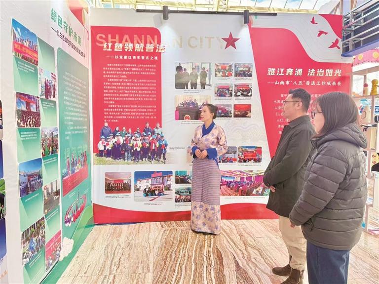 བྱེད་སྒོ་སྤེལ་ཡུལ་དུ་བསྒྲིགས་པའི“བརྒྱད་ལྔ”ཁྲིམས་ལུགས་ཁྱབ་གདལ་གྲུབ་འབྲས་འགྲེམས་ཁུལ་གྱིས་པར་རིས་འགྲེམས་པང་དང་། དངོས་པོའི་འགྲེམས་སྟེགས། འགུལ་རིས་བརྙན་ཤེལ། དེ་བཞིན་གྲངས་འཛིན་འཕྲུལ་མི་སོགས་རྣམ་པ་སྣ་ཚོགས་ལ་བརྟེན་ནས་རང་ལྗོངས་སུ“ཆེད་དོན་བྱ་སྤྱོད་ཆེ་མོ་དྲུག”ལས་ཐོབ་པའི་དངོས་དངོས་རྗེན་རྗེན་གྱི་གྲུབ་འབྲས་བཤམས་པ་དང་། བོད་ལྗོངས་ཚོམས་ཆེན་གྱི་བརྙན་ཤེལ་ཐོག་རྒྱ་བོད་སྐད་ཡིག་གཉིས་ཀྱི་ལམ་ནས་ཁྲིམས་སྐྱོང་སྐོར་གྱི་ཀོ་ཕིག་དང་ཁྲིམས་ལུགས་དྲིལ་བསྒྲགས་ལ་ཐོབ་པའི་གྲུབ་འབྲས་རེས་སྐོར་གྱིས་བསྟན་པས་དེར་འདུས་པའི་མི་རྣམས་ཀྱིས་རྩ་ཁྲིམས་ལ་བརྩི་སྲུང་དང་། རྩ་ཁྲིམས་སློབ་སྦྱོང་། རྩ་ཁྲིམས་སྲུང་སྐྱོང་། རྩ་ཁྲིམས་བེད་སྤྱོད་བཅས་བྱེད་དགོས་པའི་དྲན་སྐུལ་ཡང་ཡང་བྱས་པ་རེད། ད་དུང་ས་ཡུལ་དངོས་སུ་བཙུགས་པའི་བཅའ་ཁྲིམས་བློ་འདྲི་སྟེགས་བུས་མང་ཚོགས་ལ་ཁྱིམ་ཚང་གཏུམ་སྤྱོད་དང་། ངལ་རྩོལ་འགན་སྲུང་། འཛད་སྤྱོད་ཁེ་དབང་སོགས་ཁོངས་ཀྱི་ཞབས་ཞུ་དེ་མ་ཉིད་དུ་སྒྲུབ་བཞིན་ཡོད་པ་རེད།