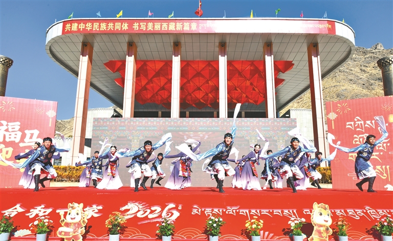 ཉེ་ཆར། “མེ་རྟའི་ལོ་གསར་བསུ། འཆམ་མཐུན་ཁྱིམ་ཚང་གཅིག”ཅེས་པའི་ལྷ་ས་གྲོང་ཁྱེར་གྱི་2026ལོའི“ང་ཚོའི་དུས་ཆེན། དཔྱིད་གསར་དུས་ཆེན་དང་བོད་ཀྱི་ལོ་གསར”ཞེས་པའི་བརྗོད་དོན་གཙོ་བོའི་བྱེད་སྒོ་སྟོད་ལུང་བདེ་ཆེན་ཆུས་མི་རིགས་མཐུན་སྒྲིལ་སྤྱི་གླིང་དུ་སྤེལ་ཞིང་། འདི་ནི་རིག་རྩལ་འཁྲབ་སྟོན་བྱེད་བཞིན་པ།