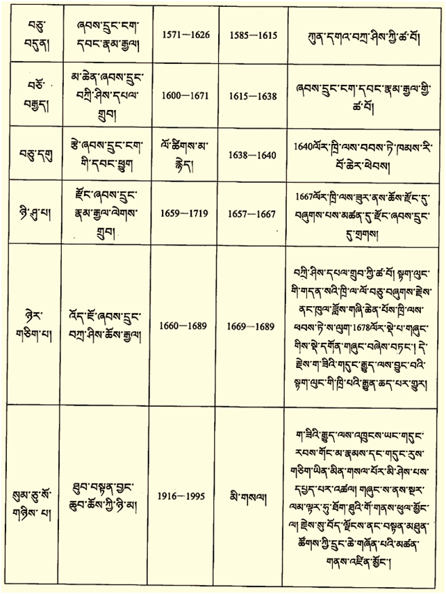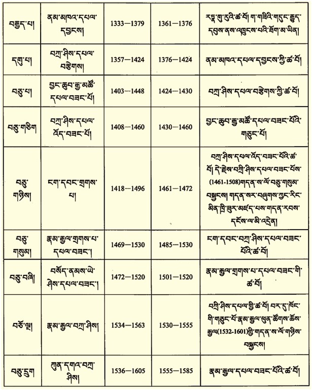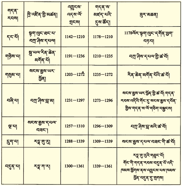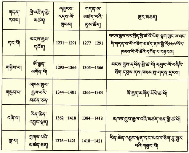 གདན་རབས་བརྒྱད་པ་ཀུན་སྤངས་ནམ་མཁའ་དཔལ་དབྱངས་ནི། འཕན་ཡུལ་རིག་པའི་འབྱུང་གནས་ཀྱི་སའི་ཆ་དར་ཡུལ་ཞེས་བྱ་བར་ཡབ་ཡོན་བདག་ཡེ་ཤེས་རིན་ཆེན་དང་ཡུམ་ཕྱུག་མོ་དཔལ་ལེའི་སྲས་སུ་ཆུ་བ་སྤྱི་ལོ་1333ལོར་སྐུ་འཁྲུངས། གདན་ས་ལོ་གྲངས་བཅོ་ལྔ་མཛད་ནས་མཐར་སྤྱི་ལོ་1379ལོར་དགོངས་པ་རྫོགས། “ཆོས་རྗེ་གདན་ས་བ་དབུས་སུ་འཁྲུངས་པ་རྣམས་ཀྱི་ཐོག་མ་འདི་ཡིན”④དེ་ནི་དབུས་སུ་འཁྲུངས་པ་རྣམས་ཀྱི་ཐོག་མ་ཡིན་ལ“དར་ཡུལ”⑤སྟེང་ཁང་སོགས་སུ་སྟག་ལུང་སྡེ་པ་ཞེས་པའི་ག་ཟིའི་གདུང་རབས་གཞི་རྟེན་ཆགས་པའི་ཐོག་མའང་ཡིན། དེ་རྗེས་ག་ཟིའི་རུས་རྒྱུད་ལས་ཆད་པའི་སྟག་ལུང་གི་གདན་རབས་བཅུ་གཉིས་ལྷག་རིམ་བཞིན་དབུས་ནས་བྱོན་ཡོད་དེ། དེ་དག་ཡང་གོང་མ་རྣམས་དང་འདྲ་བར་མཁས་གྲུབ་གཉིས་ལྡན་གྱི་སྐྱེ་བོ་བསམ་གྱིས་མི་ཁྱབ་པ་ཤ་སྟག་ཡིན་ཏེ། དེའི་ཁྲོད་བོ་དོང་ཕྱོགས་ལས་རྣམ་རྒྱལ་དང་ཤར་རྒྱལ་བ་ཙོང་ཁ་པ་ཆེན་པོ། ལྕང་ལུང་པ་གཞོན་ནུ་བློ་གྲོས་སོགས་ཀྱིས་ཞབས་ལ་གཏུགས་ཤིང་གདམས་ངག་ཞུས་མྱོང་ལ་རྒྱ་ནག་གོང་མས་གུ་ཤྲིའི་མཚན་གསོལ་①མྱོང་བའི་གདན་རབས་དགུ་པ་བཀྲ་ཤིས་དཔལ་བརྩེགས་དང་། ཕག་གྲུ་དང་འབྲི་གུང་བཀའ་རྒྱུད་སོགས་ཀྱི་ཟབ་ཆོས་ཐུགས་ལ་མངའ་ཞིང་། སྒམ་པོ་སྤྱན་སྔ་པ། ཞྭ་དམར་ཆོས་ཀྱི་གྲགས་པ། འབྲུག་རྒྱལ་དབང་ཆོས་རྗེ་སོགས་ཀྱིས་ཞབས་ལ་གཏུགས་ནས་གདམས་ངག་ཞུས་མྱོང་བའི་གདན་རབས་བཅུ་གཉིས་པ་ངག་དབང་བཀྲ་ཤིས་དཔལ་བཟང་། གཞན་གདན་རབས་བཅུ་བདུན་པ་ཞབས་དྲུང་ངག་དབང་རྣམ་རྒྱལ་སོགས་མི་ཡོད།