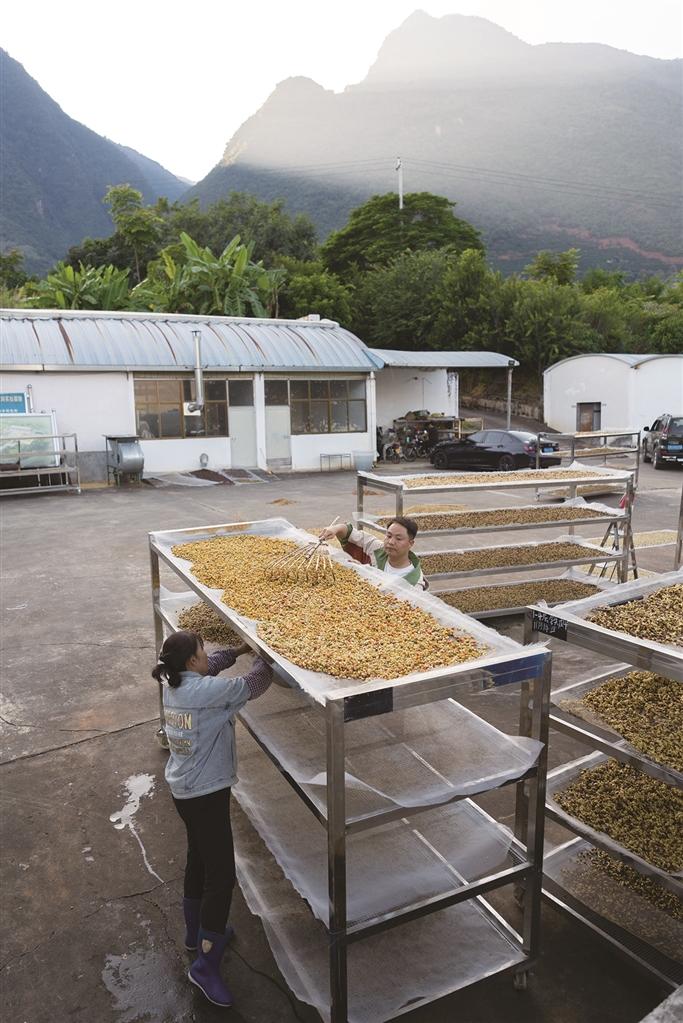 ཉེ་ཆར། ཡུན་ནན་ཞིང་ཆེན་པའོ་ཧྲན་གྲོང་ཁྱེར་དུ་ཁོ་ཧྥེ་ལ་འབྲས་བུ་སྨིན་པའི་དུས་ལ་སླེབས་པ་དང་། ས་གནས་དེ་གའི་ཁོ་ཧྥེ་འདེབས་མཁན་ཞིང་པས་གནམ་གཤིས་ཡག་པའི་དུས་ཚོད་དམ་འཛིན་གྱིས་ཁོ་ཧྥེའི་སྲན་མ་འཐུ་བ་དང་ལས་སྣོན་བྱས་ཤིང་། འདི་ནི་ཁོ་ཧྥེའི་སྲན་མ་འདེབས་མཁན་ཞིང་པས་ཁོ་ཧྥེ་སྲན་མ་བསིལ་སྐམ་གཏོང་བཞིན་པ།