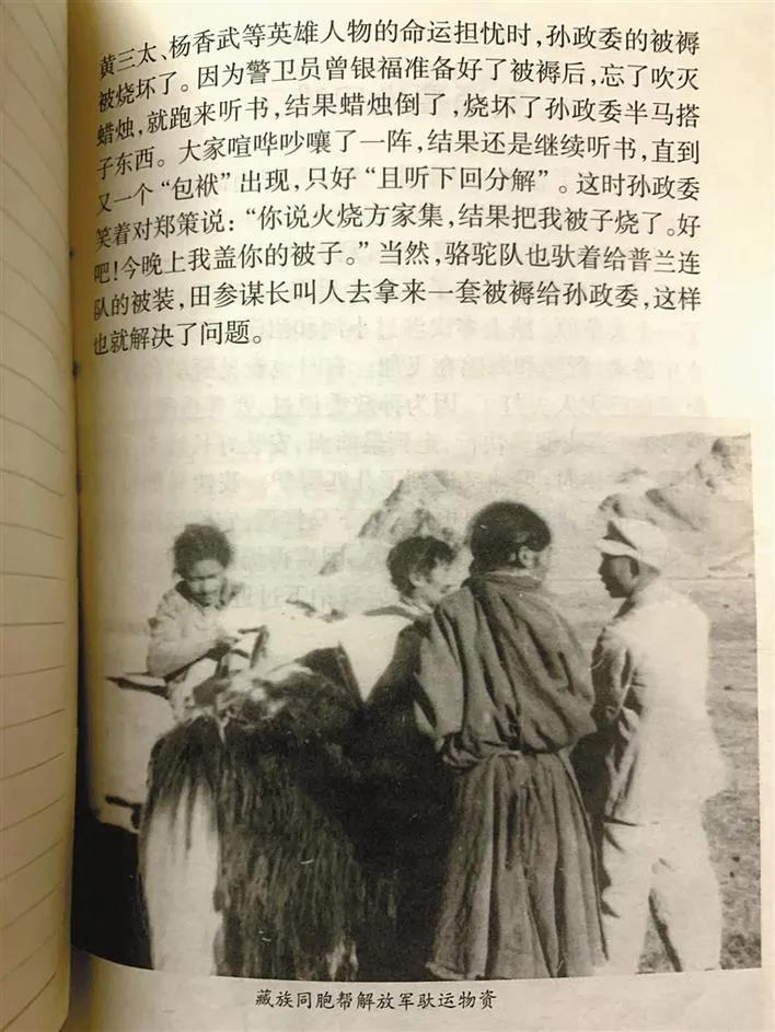 བློ་མཐུན་ཡོན་གོ་ཞང་གིས་བརྩམས་པའི《ངོ་མཚར་ཆེ་བའི་མངའ་རིས》ཞེས་པའི་དཔེ་དེབ་ཀྱི་བར་བཅུག་རི་མོ་སྟེ། དབུས་པ་ཕུན་ཚོགས་རྣམ་རྒྱལ(གཡས་ཀྱི་གཉིས་པ)གྱིས་བཅིངས་འགྲོལ་དམག་ལ་དངོས་ཟོག་དབོར་རོགས་བྱེད་བཞིན་པ།