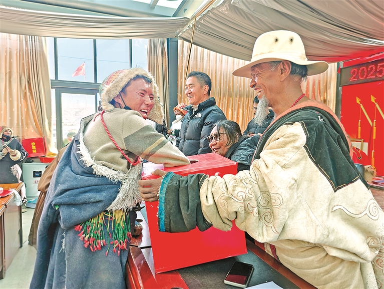 ཕུན་ཚོགས་ཚེ་རིང་གིས་བཤད་པའི་བགོ་འགྲེམས་དེ་ཟླ་11ཚེས་6ཉིན་སྤྲད་ཅིང་། གཙག་བུ་གྲོང་ཚོའི་མཉམ་སྡེབ་དཔལ་འབྱོར་ནས་2025ལོར་བགོ་འགྲེམས་སྒོར་ཁྲི་353བརྒྱབ་སྟེ་གྲོང་ཚོ་དེ་ཡོངས་ཀྱི་ཡུལ་མི་མི་རེར་དངུལ་སྨར་སྒོར་3000རེ་སྤྲད་ཡོད། གྲོང་ཚོའི་མཉམ་སྡེབ་དཔལ་འབྱོར་གྱི་ཡོང་འབབ་དེ་གཙོ་བོ་ར་ཁུལ་དཀར་གྱི་ཐོན་ལས་འཕེལ་རྒྱས་བཏང་བ་དང་བྱེ་རྡོ་ར་བ་དང་ས་ཕག་བཟོ་གྲྭ་སོགས་གཉེར་སྐྱོང་བྱས་པ་ལས་བྱུང་བ་རེད།