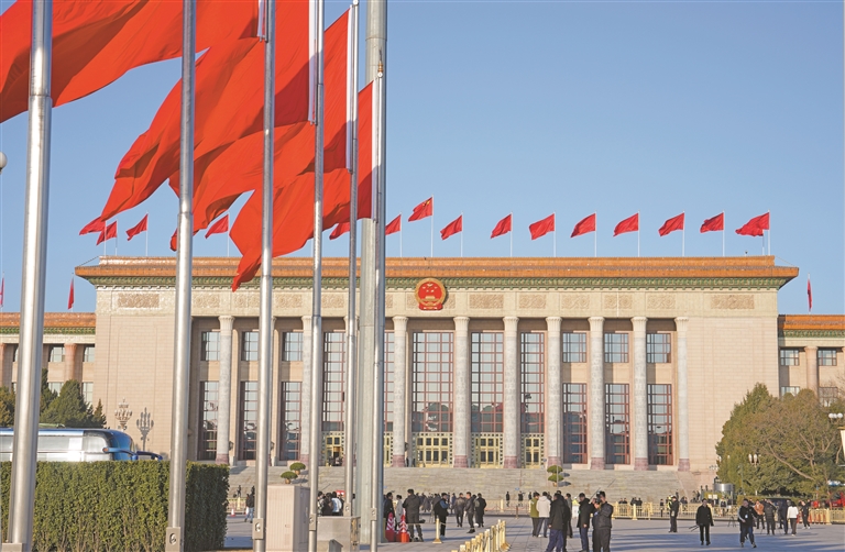 ཟླ་3ཚེས་11ཉིན་གྱི་སྔ་དྲོར། རྒྱལ་ཡོངས་སྲིད་གྲོས་སྐབས་བཅུ་བཞི་པའི་ཚོགས་འདུ་ཐེངས་བཞི་པ་པེ་ཅིང་མི་དམངས་ཚོགས་ཁང་ཆེ་མོར་གྲོལ་ཞིང་། འདི་ནི་མི་དམངས་ཚོགས་ཁང་ཆེ་མོའི་ཕྱི་རོལ་གྱི་རྣམ་པ་ཡིན་པ།
