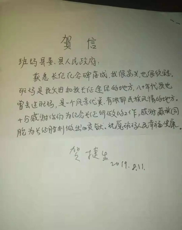 དམག་དཔོན་ཧུ་ཅེ་ཧྲེང་གིས་པུའུ་ཀྲང་ལུའོ་ཡོན་པང་གི་སྙན་ཞུ་བྱས་པར་གསན་རྗེས་ཧ་ཅང་དགའ་སྤྲོ་ཆེན་པོ་བྱུང་སྟེ། ཁོ་མོས་གསུང་རྒྱུར། བདག་གི་ཨ་ཕས་བཤད་ན་དམར་དམག་རྒྱང་སྐྱོད་པདྨར་བརྒྱུད་སྐབས་ང་ད་དུང་སྒྲིལ་གཟན་དུ་ཡོད་ཟེར། ལོ་རབས་བརྒྱད་ཅུའི་ནང་ང་རང་པདྨར་འགྲོ་མྱོང་ལ།དེ་ནི་ཡུལ་ལྗོངས་ལྟ་ན་སྡུག་ཅིང་མི་རིགས་ཀྱི་ཡུལ་སྲོལ་གོམས་གཤིས་ཟབ་པའི་ས་ཆ་ཞིག་རེད། ཁྱེད་ཚོས་རྒྱང་སྐྱོད་རྗེས་དྲན་གྱི་ཆེད་དུ་སྒྲུབ་པའི་ལས་དོན་དང་བོད་རིགས་སྤུན་ཟླས་གསར་བརྗེར་རྒྱལ་ཁ་ཐོབ་ཆེད་ལེགས་སྐྱེས་ཕུལ་བར་ཐུགས་རྗེ་ཆེ་ཞུས་པ་དང་། པདྨ་མི་དམངས་བདེ་སྐྱིད་ལྡན་པའི་སྨོན་འདུན་ཞུས་པ་ཡིན།
