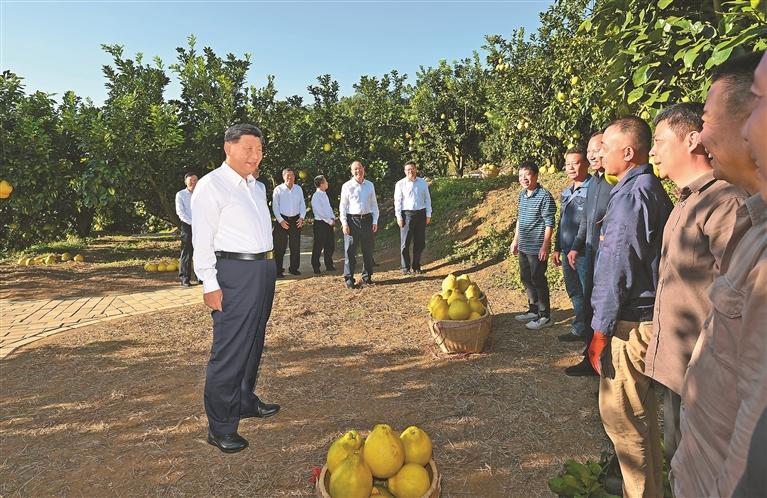 ཤིང་ཏོག་ཅིན་ཡིའུ་ནི་མེ་ཀྲོའུ་ཡི་ཁྱད་ལྡན་ཞིང་ཟོག་ཡིན་པ་དང་། ད་ལོ་ཤིང་ཏོག་ཡིའུ་ཙིར་ལོ་ལེགས་བྱུང་ཡོད། ཞི་ཅིན་ཕིང་ཡན་དབྱང་གྲོང་རྡལ་ནན་ཧྥུའུ་ཤིང་ཏོག་ཅིན་ཡིའུ་འདེབས་འཛུགས་རྟེན་གཞིར་ཕེབས་པ་དང་། དེ་གའི་འགྲེམས་སྟོན་ཁང་དུ་ཀོང་ཏུང་གིས་གསར་བརྗེའི་ཁུལ་རྙིང་པར་རྒྱབ་སྐྱོར་བྱེད་ཤུགས་ཆེ་རུ་བཏང་བ་དང་གྲོང་གསེབ་ཕྱོགས་ཡོངས་ནས་དར་རྒྱས་ཡོང་བར་སྐུལ་འདེད་བཏང་བ་སོགས་སྐོར་གྱི་སྙན་སེང་གསན་ཞིང་། ཤིང་ཏོག་ཡིའུ་ཙི་དང་དེ་བཞིན་ཤིང་ཏོག་ཡིའུ་ཙིའི་ལས་སྣོན་ཐོན་རྫས་དང་རིག་གནས་བསམ་བཀོད་ཐོན་རྫས་ལ་གཟིགས་ཞིབ་གནང་བ་དང་སྦྲགས། འབྲས་ཤིང་ར་བར་ཕེབས་ནས་ཤིང་འབྲས་འདེབས་མཁན་དང་ཞིང་ལས་ལག་རྩལ་མི་སྣ་དང་བྱམས་བརྩེའི་སྤེལ་རེས་ཀྱང་གནང་བ་རེད། ད་ལོ་ཤིང་ཏོག་ཅིན་ཡིའུ་ལ་ལོ་ལེགས་བྱུང་བའི་ཁར་ཚོང་ལམ་ཡང་ཡག་པོ་ཡོད་པ་མཁྱེན་རྗེས། ཞི་ཅིན་ཕིང་དགྱེས་ཚོར་ཆེན་པོ་བྱུང་ཞིང་། ཁོང་གིས། གྲོང་གསེབ་ཀྱི་ཁྱད་ལྡན་ཐོན་ལས་འཕེལ་རྒྱས་གཏོང་བ་ནི་གྲོང་གསེབ་ཕྱོགས་ཡོངས་ནས་དར་རྒྱས་འགྲོ་བར་སྐུལ་འདེད་གཏོང་བའི་རྨང་གཞི་ཡིན་པས། ཚན་རྩལ་བཀོལ་སྤྱོད་ལ་ཤུགས་སྣོན་རྒྱག་པ་དང་། ཞིང་ལས་དང་། རིག་གནས། ཡུལ་སྐོར་བཅས་མཉམ་འདྲེས་ལ་སྐུལ་འདེད་གཏོང་བ། ཐོན་ལས་འཁོར་འབྲེལ་རྒྱུན་ཆད་མེད་པར་སྣུར་སྲིང་དང་ཟུར་སྣོན་རིན་ཐང་མཐོ་རུ་གཏོང་བ་བཅས་བྱས་ནས་ཞིང་པ་མང་ཚོགས་དེ་བས་མང་བར་འབབ་འཕར་ཕྱུག་འགྱུར་ཡོང་བའི་སྐུལ་ཁྲིད་བྱེད་དགོས་ཞེས་གསུངས་པ་རེད།