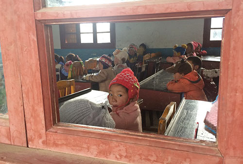 ཕྱི་ཉིན་གྱི་ཚོགས་འདུའི་ལས་རིམ་ནི་ཕྱི་ལ་འཆམ་འཆམ་འགྲོ་བ་ཡིན་མོད། མང་ཤོས་རང་རང་གི་ས་རུ་གྲོལ་སོང་བས་ངས་རྒན་ཨ་འབྱུང་ལགས་ལ་ཁ་པར་བཏང་ཞིང་རང་ཉིད་ཁོང་གི་སློབ་གྲྭ་ལ་བལྟ་རུ་འགྲོ་འདོད་ཅེས་བཤད་པ་ཡིན། ཁོང་གིས་ཡོང་གི་རེད། གད་སྙིགས་ར་བའི་བཞི་མདོ་ལ་ཤོག་དང་ང་རང་བསུ་རུ་ཡོང་ཆོག་ཅེས་གསུངས་བྱུང་། དེ་ལྟར་ཕྱི་དྲོ་ཆུ་ཚོད་གཉིས་དང་ཕྱེད་ཀ་ལ་དུས་བཏབས་རྗེས་ངའི་སེམས་སུ་གད་སྙིགས་ར་བའི་བཞི་མདོ་ན་ཡོད་པའི་སློབ་གྲྭ་དེ་ནི་ཇི་འདྲ་ཞིག་ཡིན་སྲིད་དམ་སྙམ་པའི་འཆར་སྣང་ཞིག་འགོག་མེད་དུ་སྐྱེས་བྱུང་། གད་སྙིགས་ར་བ་ནི་གྲོང་མཁར་དང་བར་ཐག་སྤྱི་ལེ་ལྔ་ཡས་མས་ཤིག་གི་གོང་དུ་ཡོད་པས། ང་དང་གྲོགས་པོ་གཉིས་དེ་ལ་བསླེབས་དུས་ཕལ་ཆེར་ཆུ་ཚོད་ཕྱེད་ཀ་ཙམ་གྱིས་འཕྱི་འབྱོར་ཐེབས་སོང་། སྐབས་དེར་གནམ་གཤིས་ལེགས་པོ་མིན་ཞིང་། ཁ་བ་ཁྱེར་བའི་རླུང་བུ་གྲང་མོ་ཞིག་ལྡང་ཡོང་བས་གྲང་འདར་རྒྱག་དགོས་པ་ཞིག་འདུག གད་སྙིགས་ར་བའི་བཞི་མདོ་ཞེས་པ་ནི་མ་གཞི་འོད་སྣང་ཞེས་པའི་གྲོང་ཚོ་ཞིག་གི་བཞི་མདོ་རེད། ངས་གྲོང་ཚོའི་ཕྱོགས་ནས་རྒན་ཨ་འབྱུང་ལགས་ང་ཚོའི་ཕྱོགས་སུ་ཡོང་བ་མཐོང་བྱུང་། ཁོང་གིས་ཁ་སང་གི་ལྭ་བ་དེ་མ་བརྗེ་བར་གོན་འདུག་ལ་གནམ་གཤིས་གྲང་ངར་ཆེ་བས། ལྭ་བའི་སྟེང་ལ་ཟི་ཚར་གྱི་སྟོད་ཐུང་ཞིག་གཡོག་འདུག ཁོང་འཛུམ་བཞིན་དེ་རིང་གནམ་གཤིས་ལེགས་པོ་མི་འདུག་གསུངས་ཤིང་ལག་འཇུ་གནང་བྱུང་ལ། རྩུབ་ཅིང་འཁྱག་པའི་ལག་པ་དེས་ང་ཚོ་ཁོང་གི་སློབ་གྲྭའི་ཕྱོགས་སུ་ཁྲིད་གནང་བྱུང་། སློབ་གྲྭ་དེ་ནི་སྔར་གྱི་གྲོང་ཚོའི་སློབ་ཆུང་གི་ཤུལ་ཡིན་འདུག་ལ་ར་སྐོར་སྒོ་སྦུག་གཉིས་ཡོད་པའི་སྦུག་མ་ནི་ཐབ་ཚང་དང་ཟ་ཁང་སོགས་ཡིན་པ་དང་། ཕྱི་མའི་ཉིན་སྲིབ་གཉིས་ཀ་སློབ་ཁང་ཡིན་ཞིང་། བྱིས་པ་ཚོས་དཔེ་ཆ་ཀློག་བཞིན་པའི་སྒྲ་གཡས་གཡོན་གཉིས་ཕན་ཚུན་ལ་འགྲན་པ་བཞིན་མཆེད་ཡོང་། ཁོང་གིས་ང་ཚོ་སྦུག་ལ་འགྲོ སྦུག་ལ་མེ་ཡོད་ཟེར་ཞིང་། སྦུག་ལ་ཁྲིད་བྱུང་། སྦུག་གི་ཁང་མིག་ཅིག་ལ་འཛུལ་དུས་དེའི་ནང་དུ་སྐུབ་སྟེགས་རིང་བོ་ཁ་ཤས་དང་ཐབ་ཁ་ཞིག་འདུག་ལ། ཆ་སྒམ་གྱི་སྟེང་དུ་ལོ་མང་སོང་བའི་བརྙན་འཕྲིན་རྙིང་བ་ཞིག་ལས་གཞན་ཁྱིམ་ཆས་གྲལ་དག་པོ་ཞིག་མཐོང་རྒྱུ་མ་བྱུང་། ང་ཚོ་ཐབ་ཀ་དེའི་མཐའ་བསྐོར་ནས་བཙོག་རྗེས་དགེ་རྒན་བུ་མོ་ཞིག་གིས་ཐབ་ཀ་ལ་མེ་ཤིང་བསྣན་པས་ཁང་བའི་ནང་ཇེ་དྲོ་ལ་ཕྱིན་ཞིང་། ལྕགས་ཀྱི་ཕོར་བའི་ནང་དུ་བླུགས་པའི་ཇ་ནག་ཚ་བོ་དེ་བཏུང་བས་ཁོག་ཀྱང་དྲོས་པར་གྱུར་སོང་། དེ་ནས་ངས་ཁོང་ལ་འདྲི་འདོད་པའི་དྲི་བ་ཁ་ཤས་དྲིས་པ་ཡིན་ལ། རྒན་འབྱུང་གིས་རེ་རེ་ལ་ལན་ཡང་འཛེམས་ཟོན་མེད་པར་གནང་བྱུང་། ལན་འདེབས་པའི་སྐབས་སུ་དགེ་རྒན་བུ་མོ་དེས་རྒན་ཨ་འབྱུང་གི་སྟོད་ལྭ་དེ་ཡ