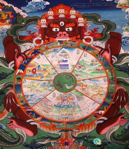 དགོན་སྡེ་ཁག་གི་འདུ་ཁང་ངམ་གཙུག་ལག་ཁང་སྒོ་འགྲམ་ནས་བྲིས་པའི་འཁོར་བའི་ཆགས་ཚུལ་དང་མཚོན་དོན་རྣམ་པར་བཤད་པ་ལ་གསུམ་ལས། རྒྱུ་གང་གིས་འཁོར་བ། གནས་གང་དུ་འཁོར་བ། ཚུལ་ཇི་ལྟར་འཁོར་བ་དང་བཅས་པའོ། དང་པོ་རིགས་དྲུག་འཁོར་བའི་གནས་འདིར་རྒྱུ་གང་གིས་འཁོར་བ་སྟོན་པ་ལ་རྟེན་འབྲེལ་ཡན་ལག་བཅུ་གཉིས་ལུགས་འབྱུང་གི་ཐོག་མར་མ་རིག་པ་ཞེས་བསྟན་པ་ཡིན་ཏེ། མ་རིག་པ་ནི་མི་ཤེས་པའམ་བླང་དོར་གྱི་གནས་ལ་རྨོངས་པར་གྱུར་ཞིང་འཁོར་བར་གྲུབ་པའི་རྒྱུའི་གཙོ་བོ་ཀུན་གཞི་མ་རིག་པ་གཉིད་མཐུག་པོ་དེ་ལས་བྱུང་བས་འཁོར་ལོའི་ལྟེ་བའི་མུ་འཁྱུད་ཀྱི་དབུས་སུ་མ་རིག་གཏི་མུག་གི་རྒྱུ་མཚོན་པའི་ཕག་གི་གཟུགས་རིས་བཀོད་ཡོད་ལ། གཉིས་པ་དེ་ལྟར་འཁོར་བར་གྲུབ་བྱེད་ཀྱི་རྒྱུ་ཡན་ལག་བཅུ་གཉིས་ཀྱི་ནང་ཚན་སྐྱེ་མཆེད་རེག་པ་གཉིས་ཀྱི་ངོ་བོ་འཁོར་ལོའི་ལྟེ་བར་ཞེ་སྡང་མཚོན་བྱེད་སྦྲུལ་གྱི་གཟུགས་རིས་དང་། གསུམ་པ་འཁོར་བ་གྲུབ་བྱེད་རྒྱུ་ཡན་ལག་བཅུ་གཉིས་ཀྱི་ནང་ཚན་སྲེད་པའི་ངོ་བོ་འཁོར་ལོའི་ལྟེ་བར་འདོད་ཆགས་མཚོན་བྱེད་བྱ་ཕུག་རོན་གྱི་གཟུགས་རིས་བཀོད་ཡོད། དེའང་ཕག་གིས་ཁ་ནས་སྦྲུལ་དང་སྦྲུལ་གྱི་ཁ་ནས་བྱ་ཐོན་པ་ལྟར་བྱས་ནས་བྲིས་པའི་དགོས་པ་ཡང་ཆགས་སྡང་གཉིས་དེ་སྐྱེད་བའི་རྒྱུ་གཙོ་བོར་གཏི་མུག་སྟེ་མ་རིག་པ་ལས་འབྱུང་བའི་རྒྱུ་མཚན་དུ་བྱས་ནས་བྲིས་པ་དང་། སྡིག་པ་མི་དགེ་བའི་ལས་ཀྱི་རྣམ་སྨིན་ལྕི་ཡང་གི་ཁྱད་པར་ལ་ལྟོས་ནས་སྦྲུལ་གྱི་ཁ་ནས་བྱ་ཐོན་པར་ལྟར་བྱས་ནས་རིམ་པ་ལྟར་ཕག་གིས་གཏི་མུག་དང་སྦྲུལ་གྱིས་ཞེ་སྡང་བྱ་ཡིས་འདོད་ཆགས་ཏེ་མཚོན་བྱ་དང་མཚོན་བྱེད་དུ་བཀོད་པའོ།། དེའང་ཕག་པ་ནི་གཏི་མུག་དབང་གིས་ཟས་དང་སྤྱོད་ལམ་གང་ལ་ཡང་གཙང་བཙོག་མི་ཕྱེད་པར་ལྟར་བླང་དོར་གྱི་གནས་ལ་རྨོངས་ཏེ་ཐར་པའི་སྲོག་རྩ་འབྱིན་པའི་ཆགས་སྡང་གཉིས་ཀྱང་ཟས་ལྟར་བསྟེན་པར་འདྲ་བ་རྒྱུ་མཚན་དུ་བྱས་ནས་བཀོད་པ་དང་། སྦྲུལ་ནི་ཞེ་སྡང་ཆེ་བས་གཞན་ལ་གནོད་སེམས་ཀྱི་མཆེ་བའི་ཕྲག་ནས་དུག་བལྡད་དེ་སེམས་ཅན་གྲངས་མེད་པའི་ཚེ་སྲོག་བཀུམ་པར་བྱེད་པ་དང་། ཞེ་སྡང་གིས་ཀུན་ནས་སློང་བའི་སྡིག་པ་མི་དགེ་བའི་ལས་ཀྱི་རྣམ་སྨིན་མི་སྡུག་པའི་གཟུགས་སུ་སྐྱེ་བར་བླངས་ཏེ་ཀུན་ལ་འཇིག་དངངས་སྟེར་བས་འདྲ་བར་རྒྱུ་མཚན་ལྟར་བཀོད་པ། བྱ་ནི་སྤྱིར་འདོད་ཆགས་མཚོན་བྱེད་ཡིན་ཡང་བྱེ་བྲག་ཏུ་བྱ་ཕུག་རོན་ནི་དེ་བས་ཀྱང་འདོད་ཆགས་ཤིན་ཏུ་ཆེ་བས་ཉིན་ལྟར་ཚོམས་ཚོམ་མེད་པར་འཁྲིག་པ་ཆེས་མང་དུ་བསྟེན་དགོས་པས་འདོད་པས་མྱོས་ཤིང་རྨོངས་པའི་དབང་གིས་རང་གིས་དགའ་མ་ལ་དུངས་བས་བཙོག་པའི་སྣབ་ལུད་སོགས་སར་འཐུ་ནས་ཁ་ལ་སྦྱིན་པ་བྱེད་པ་དང་། ངོམ་པ་མེད་པར་འདོད་ཆགས་ལ་ལོངས་སྤྱོད་པ་མཚོན་པའོ། །
