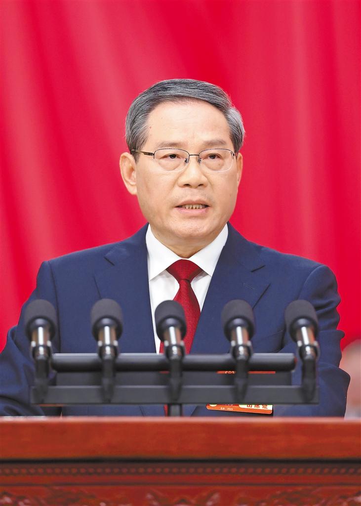 ཚོགས་འདུའི་གྲོས་རིམ་གཞིར་བཟུང་། རྒྱལ་སྲིད་སྤྱི་ཁྱབ་ཁང་གི་ཙུང་ལི་ལི་ཆང་གིས་རྒྱལ་སྲིད་སྤྱི་ཁྱབ་ཁང་གི་ཚབ་ཞུས་ནས་ཚོགས་ཆེན་ལ་སྲིད་གཞུང་གི་ལས་དོན་སྙན་སྒྲོན་གནང་བ་རེད། སྙན་སྒྲོན་དེ་ཉིད་ཆ་ཤས་གསུམ་ལ་ཕྱེ་བ་སྟེ། གཅིག་ནི་2024ལོའི་ལས་དོན་ལ་ཕྱིར་མིག་ལྟ་བ་དང་། གཉིས་ནི་2025ལོའི་དཔལ་འབྱོར་དང་སྤྱི་ཚོགས་འཕེལ་རྒྱས་ཀྱི་སྤྱིའི་བླང་བྱ་དང་སྲིད་ཇུས་ཀྱི་འཛིན་ཕྱོགས། གསུམ་ནི་2025ལོའི་སྲིད་གཞུང་ལས་དོན་གྱི་ལས་འགན་བཅས་རེད།