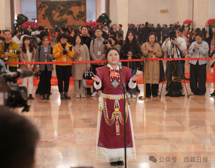 ཟླ3པའི་ཚེས10ཉིན་གྱི་སྔ་དྲོར། མི་དམངས་ཚོགས་ཁང་ཆེན་མོའི་ཤར་སྒོའི་ཀྲུང་དབྱང་ཚོམས་ཆེན་གྱི་བྱང་ངོས་སུ་གློག་འོད་འཚེར་ཞིང་མི་ཚོགས་ཀྱིས་ཁེངས་འདུག རྒྱལ་ཡོངས་སྲིད་གྲོས་སྐབས་བཅུ་བཞི་པའི་གྲོས་ཚོགས་ཐེངས་གསུམ་པའི“ཨུ་ཡོན་བགྲོད་ལམ”གྱི་མཉམ་སྡེབ་བཅར་འདྲི་ཐེངས་གསུམ་པ་དེ་གར་འཚོགས་ཤིང་། བོད་ལྗོངས་ནས་ཡོང་བའི་རྒྱལ་ཡོངས་སྲིད་གྲོས་ཀྱི་ཨུ་ཡོན་པད་མ་གཡུ་སྒྲོན་གྱིས་མོན་པ་རིགས་ཀྱི་སྲོལ་རྒྱུན་གྱི་མི་རིགས་རྒྱན་ཆས་གྱོན་ཏེ་བགྲོད་ལམ་དུ་ཕེབས་ནས། རང་ཉིད་ཀྱི་ཉམས་མྱོང་དངོས་ལ་བརྟེན་ཏེ་མེ་ཏོག་རྫོང་འདི་ཉིད“ས་མཐོའི་ཁེར་རྐྱང་གླིང་ཕྲན”ནས“མཛེས་སྡུག་ལྡན་པའི་མཐའ་མཚམས་གྲོང”དུ་འགྱུར་བའི་དུས་རབས་ཀྱི་འཕོ་འགྱུར་གླེང་།