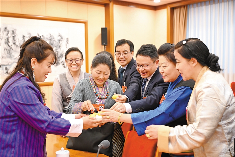འདི་ནི་ཚོགས་འདུ་གྲོལ་རྗེས་རྒྱལ་ཡོངས་མི་དམངས་འཐུས་ཚོགས་ཀྱི་འཐུས་མི་ནོར་བུ་གཡང་འཛོམས་ཀྱིས་ཕ་ཡུལ་མེ་ཏོག་ནས་འཁྱེར་ཡོང་བའི་ཡུལ་ཟོག་ཚོགས་ཞུགས་འཐུས་མི་དང་མཉམ་སྤྱོད་གནང་བཞིན་པ།