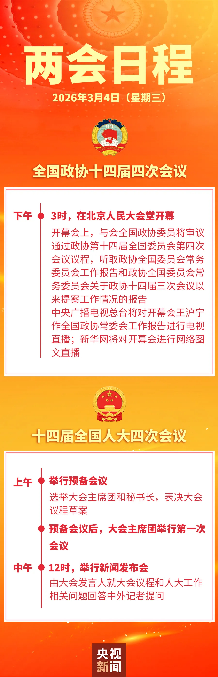 2026ལོའི་རྒྱལ་ཡོངས་ཚོགས་ཆེན་གཉིས་འགོ་ཚུགས་གྲབས་ཡོད། ཟླ་བ་3ཚེས་4ཉིན་གྱི་ཚོགས་ཆེན་གཉིས་ཀྱི་གྲོས་རིམ་ནི།